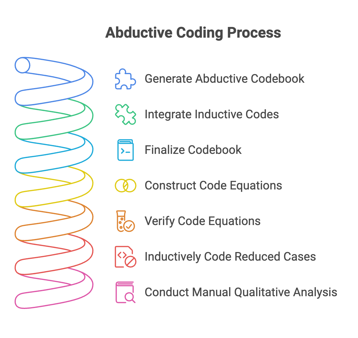 Finalize the Abductive Codebook: After saturating the inductive coding process, finalize the codebook. Apply this comprehensive codebook to the entire corpus of data, recoding previously coded segments to maintain consistency.