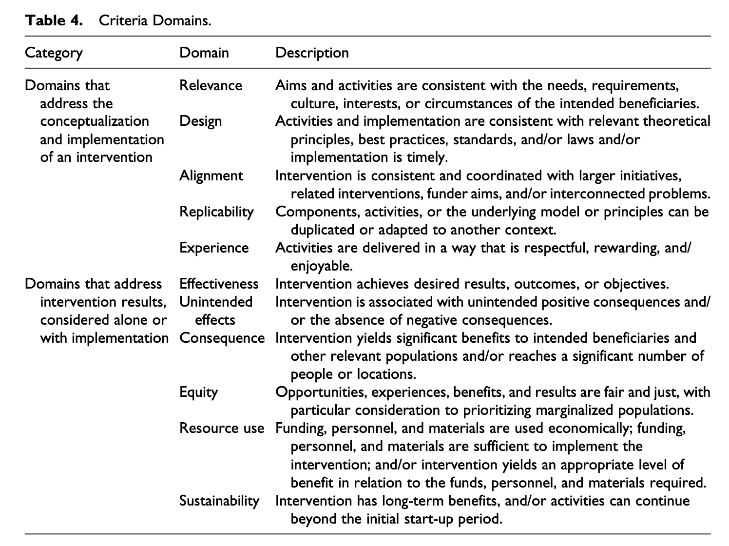 Now that we've laid out some basic ideas about criteria, let's turn to Rebecca Teasdale's popular article (1370 views and downloads as of August 2024). In her review of the literature and a sample of evaluation reports, Teasdale found that that there are many different kinds of criteria and summarized these into 11 domains. Some of the domains are about the setup and implementation of the evaluand while others are about the results. For example, criteria in the "effectiveness" domain concern the extent to which an intervention achieves its desired objective. Less obvious domains of criteria include "alignment", the extent to which the intervention is coordinated with other initiatives. For example, an anti-drug program in schools might meet criteria for effectiveness while failing to meet criteria for alignment if it ends up contradicting the school district's approach to drugs.